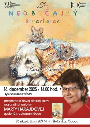 Srdečne Vás pozývame na slávnostné uvedenie do života novej detskej knihy regionálnej autorky Marty Harajdovej s názvom "Neobyčajný štvorlístok", ktoré sa v Kysuckej knižnici v Čadci bude konať v utorok 16. decembra 2025 o 14.00 hod.