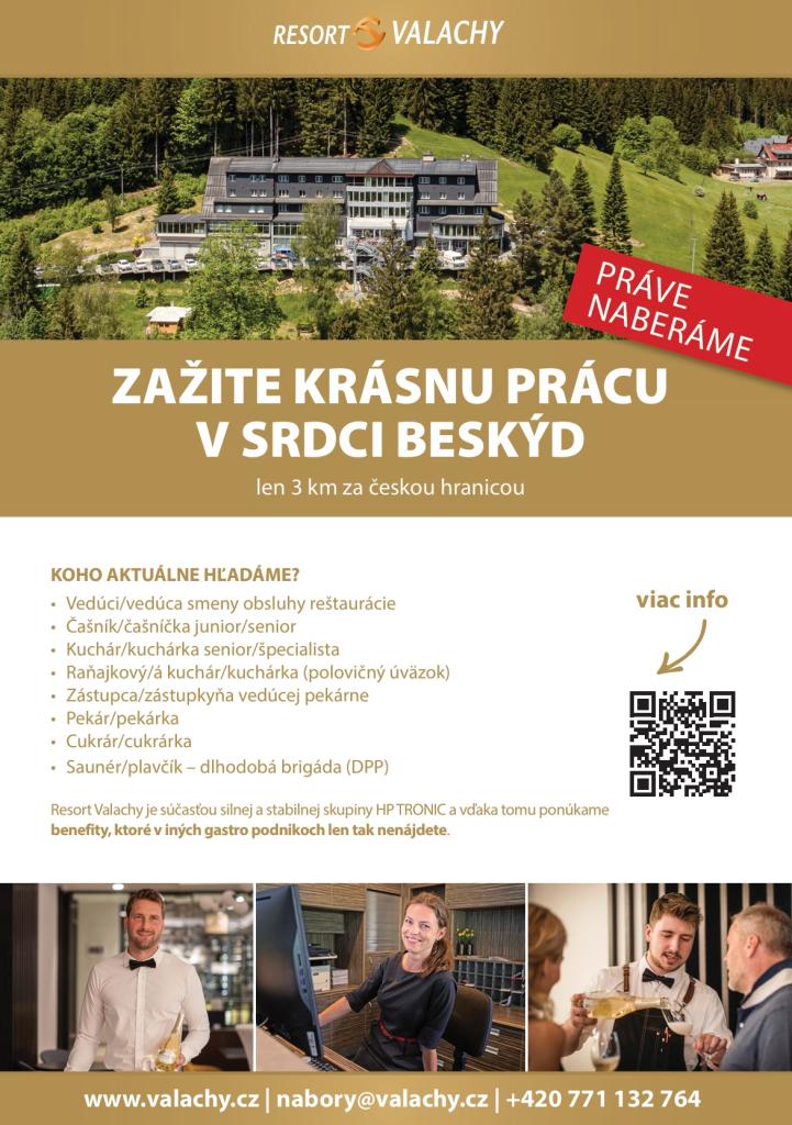 Resort Valachy, nachádzajúci sa len 3 km za českou hranicou, aktuálne hľadá zamestnancov na množstvo pracovných pozícií, vrátane vedúcej smeny v reštaurácii, čašníkov, kuchárov a pekárov. Práca v tomto rezorte je súčasťou silnej a stabilnej skupiny HP TRONIC, čo zaručuje atraktívne benefity a príjemné pracovné prostredie. Nezmeškajte príležitosť zažiť krásnu prácu v malebnej lokalite Beskýd.