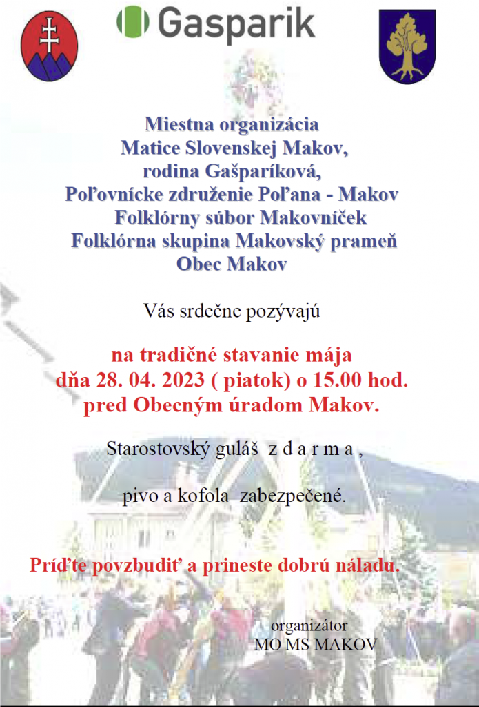 Ako každý rok nebude chýbať okrem pestrofarebnej májky výborná nálada, tekuté občerstvenie a zdarma chutný starostovský guláš.