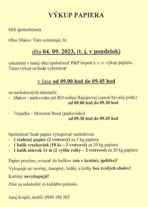 Obec Makov Vám oznamuje, že v pondelok 04.09.2023 sa v čase od 9 - do 9.45 hod uskutoční výkup papiera.
