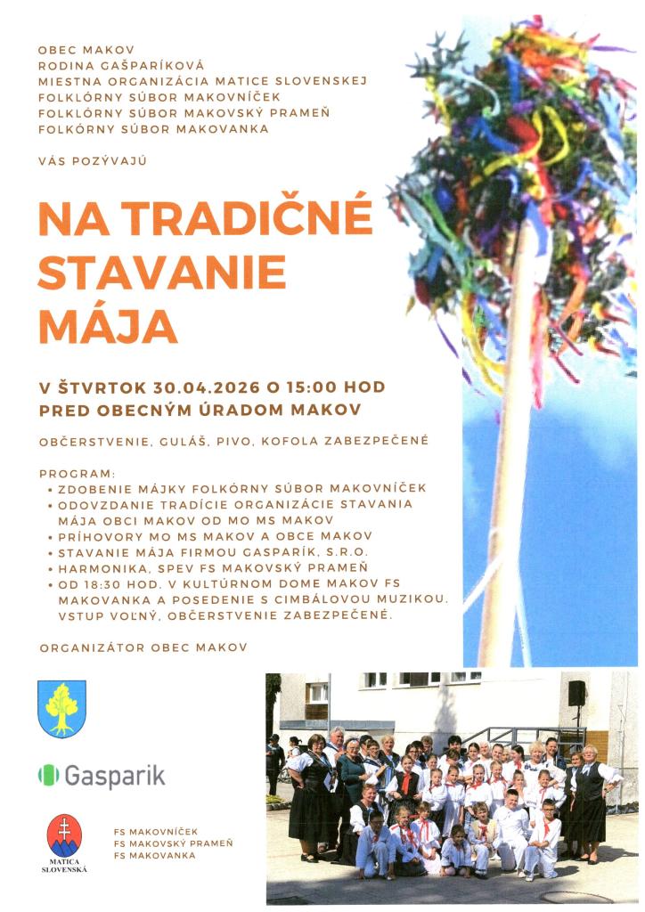 Súčasťou podujatia bude občerstvenie a bohatý program, vrátane zdobenia májky, príhovorov a hudobných vystúpení.